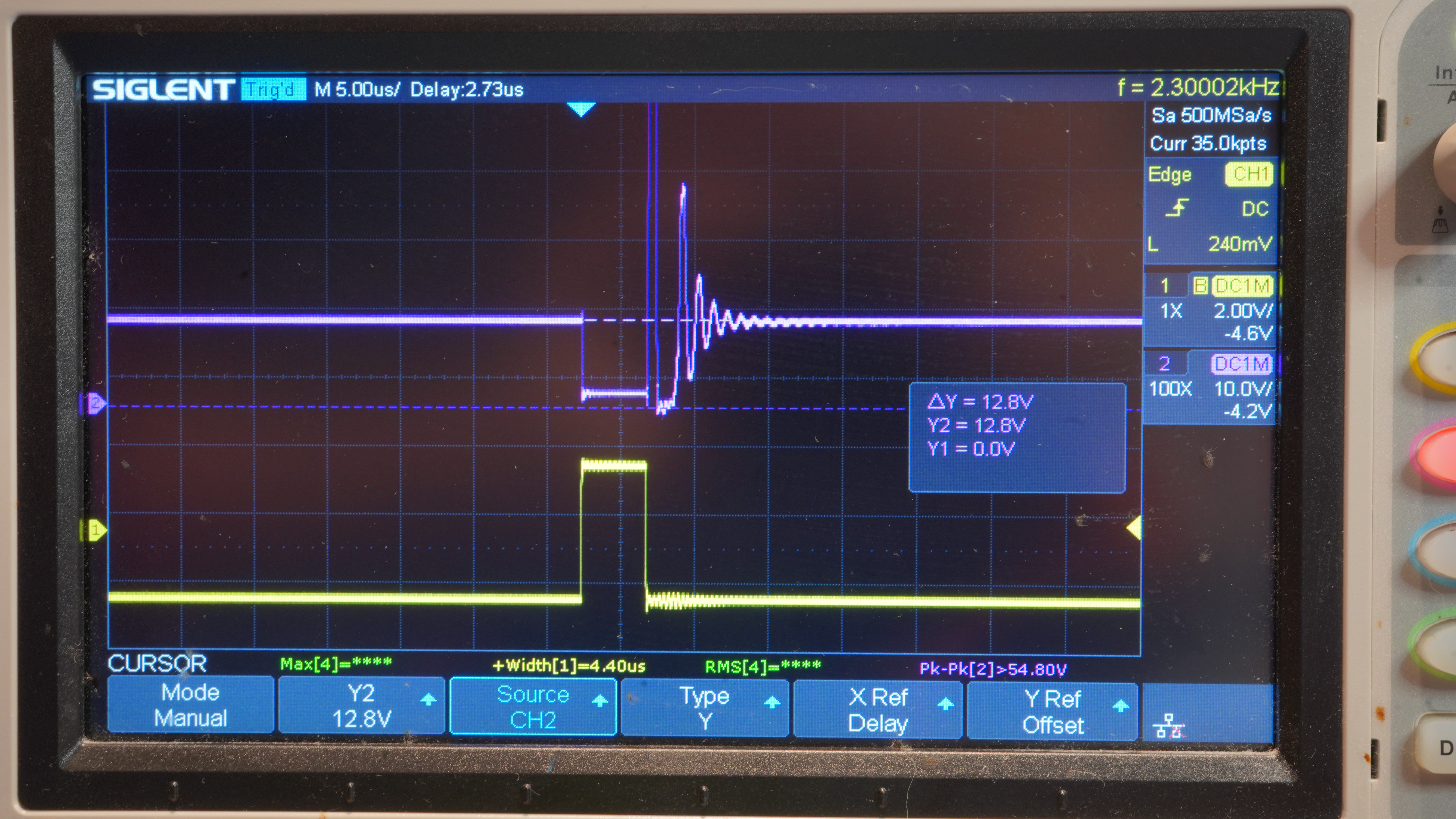 На представленной осциллограмме (бордовый луч — напряжение на стоке транзистора) показана методологическая несостоятельность расчёта энергии по формуле W = V_DS × I × t для топологии с нижним ключом. В открытом состоянии транзистора напряжение «сток-исток» близко к нулю (V_DS ≈ 0). В этом режиме произведение V_DS × I, определяющее мгновенную мощность, стремится к нулю, что приводит к некорректному расчётному значению энергии, не отражающему реальную работу, совершаемую источником питания для создания тока в индуктивности.