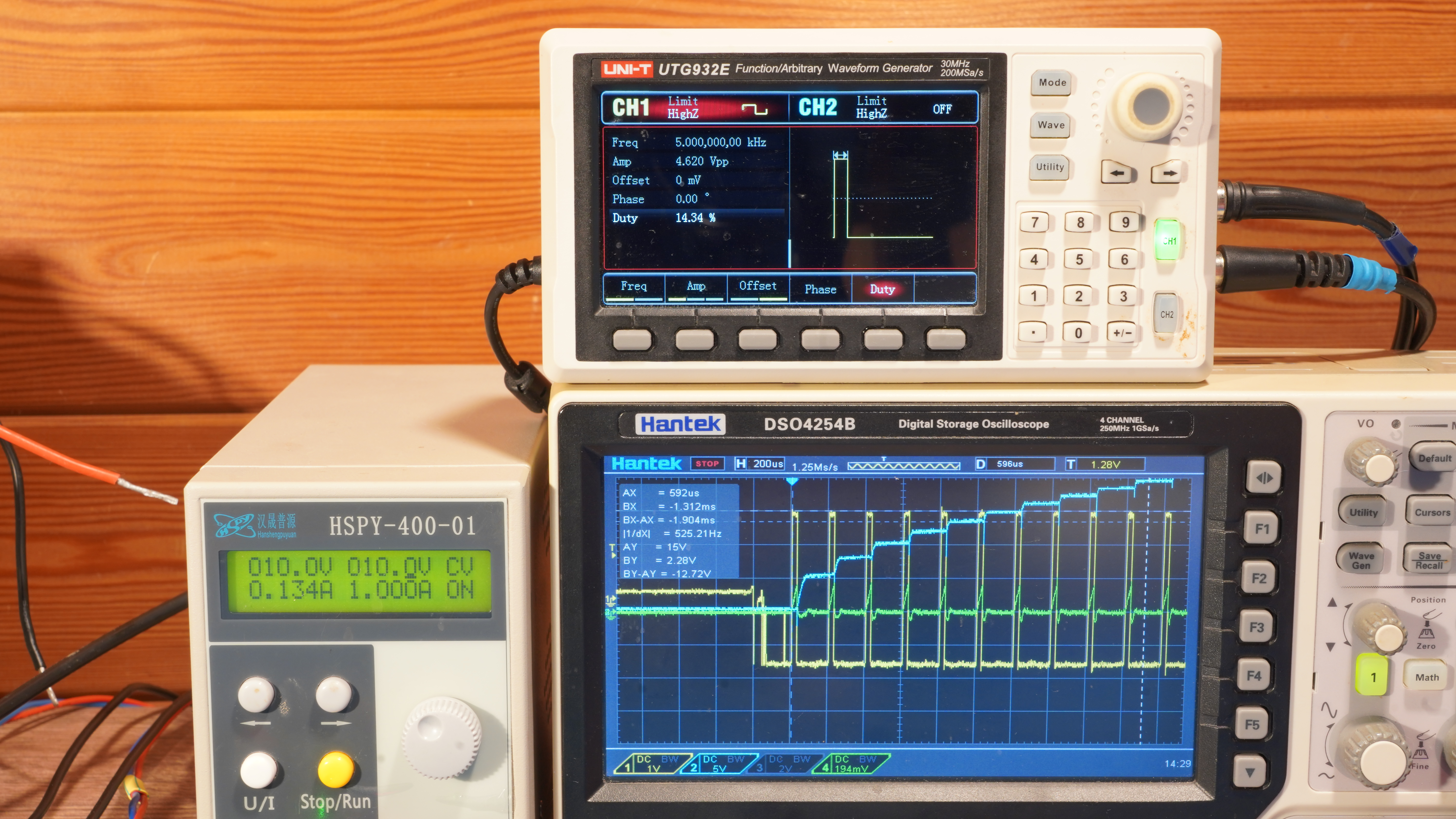 - Генератор с частотой 1 кГц управляет ключом (транзистором).