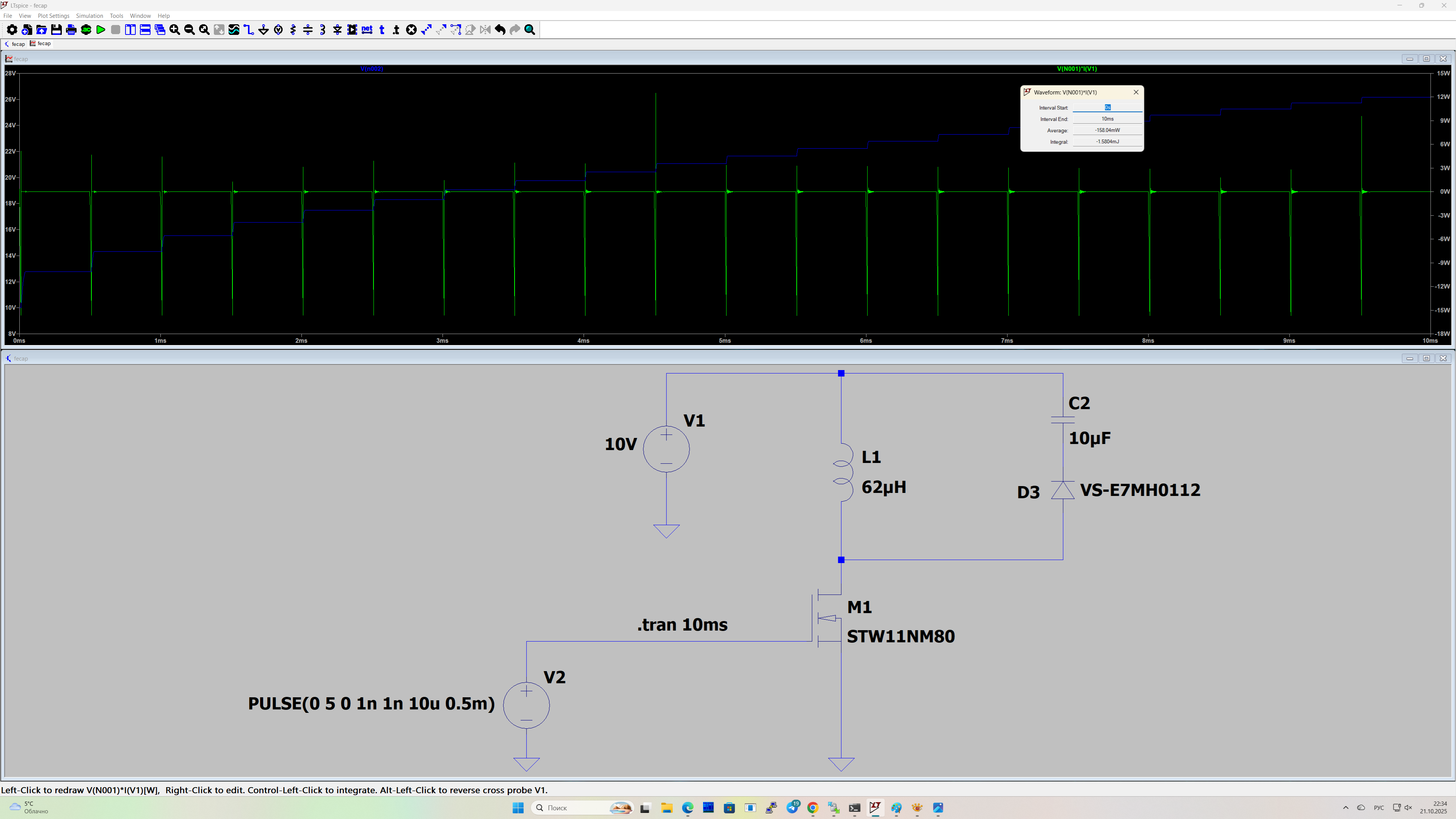Для проверки теоретических положений была выполнена серия моделирований в среде LTspice в течение временного интервала T = 10 мс при частоте импульсов f = 2 кГц (20 рабочих циклов).