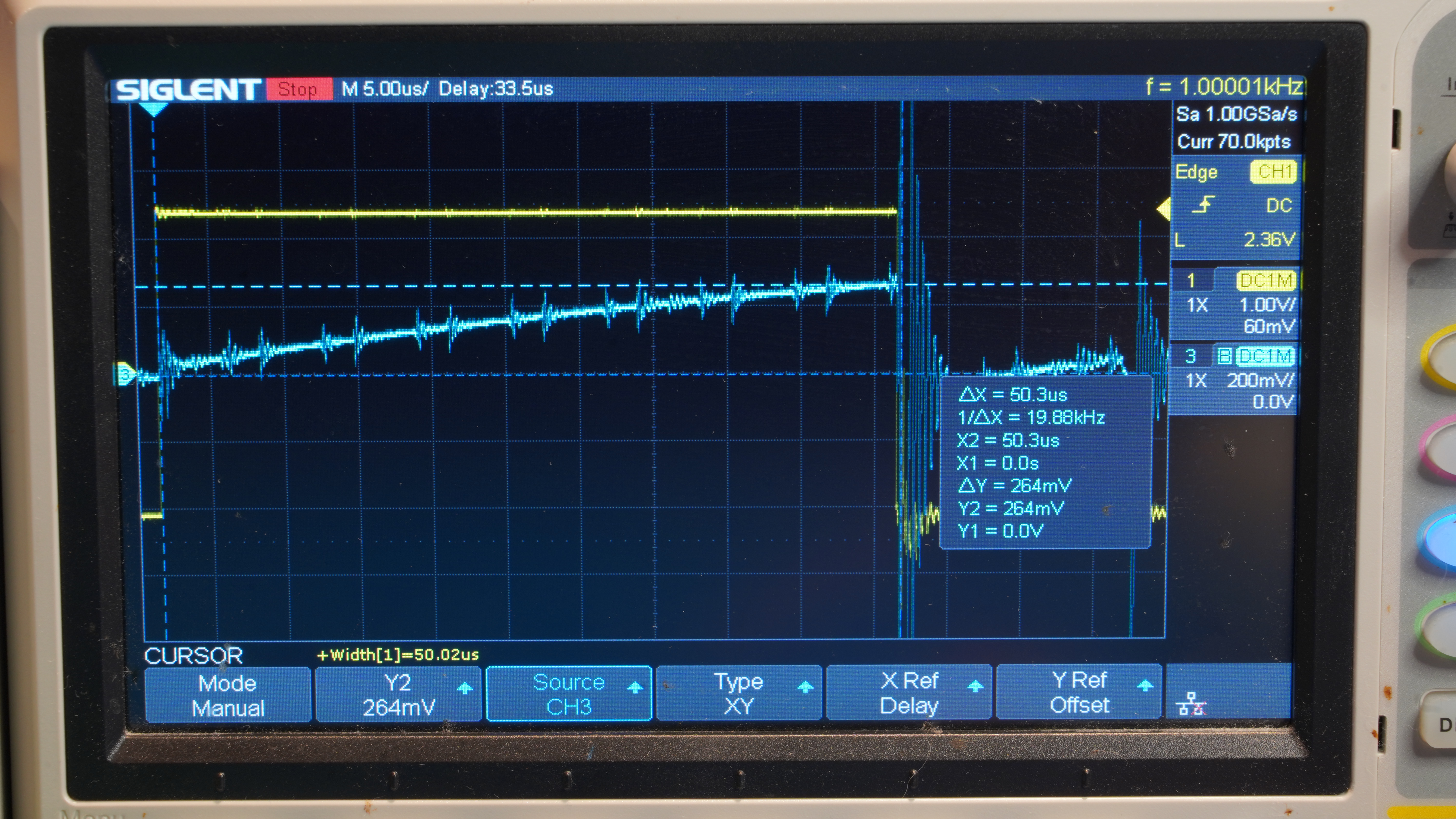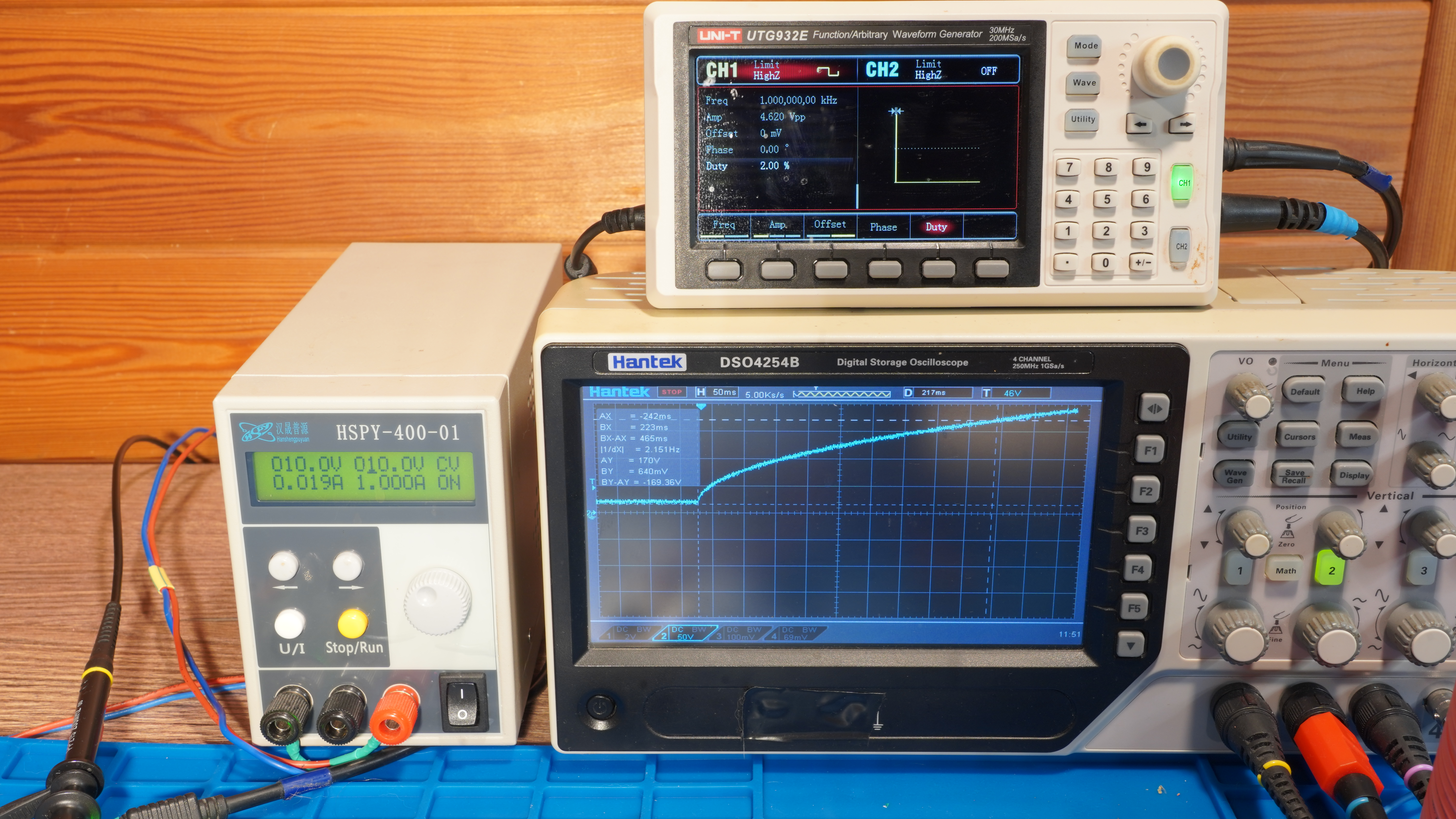 На осциллограмме наблюдается квазилинейный рост напряжения на конденсаторе. Данный режим сохраняется при условии, когда напряжение на конденсаторе значительно ниже амплитуды импульсов ЭДС самоиндукции. При приближении к предельному напряжению (например, 1000 В) эффективность передачи энергии снижается, что проявляется в уменьшении амплитуды приращения напряжения.