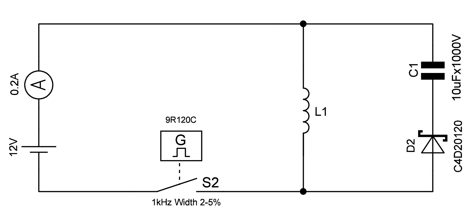 Исследование проведено на основе обратноходового преобразователя. Схема содержит последовательную цепь из источника питания, управляемого внешним генератором ключа (MOSFET) и индуктивности. Ключевой особенностью является подключение накопительного конденсатора через диод Шоттки таким образом, что конденсатор заряжается исключительно импульсами ЭДС самоиндукции, возникающей при разрыве тока, в то время как источник питания напрямую в процессе зарядки конденсатора не участвует.