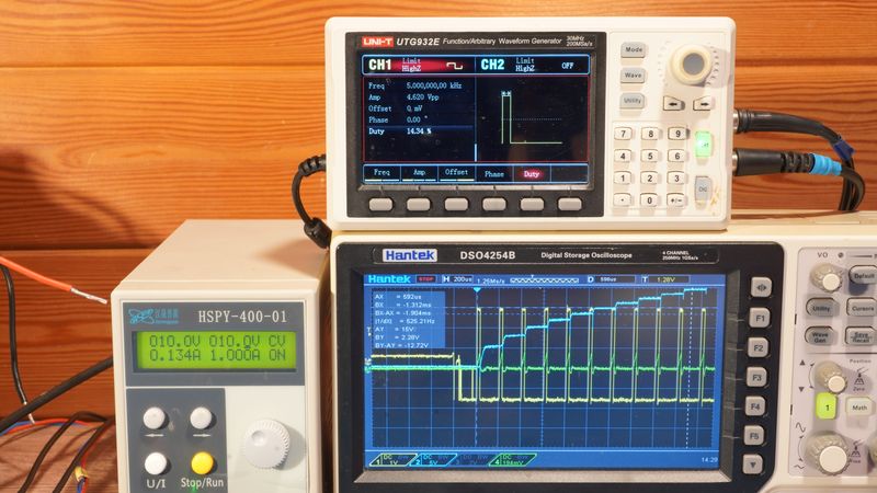 На фотографии представлена осциллограмма тока - зелёный луч осциллографа и синий - потенциал в точке разрыва. Жёлтый луч подключен к затвору транзистора. Обратите внимание, что в момент полного закрытия транзисторного ключа ток начинает убывать, и одновременно с ним начинает формироваться импульс потенциальной энергии. Это очень важный момент. Высоковольтный импульс формируется в разомкнутой цепи.