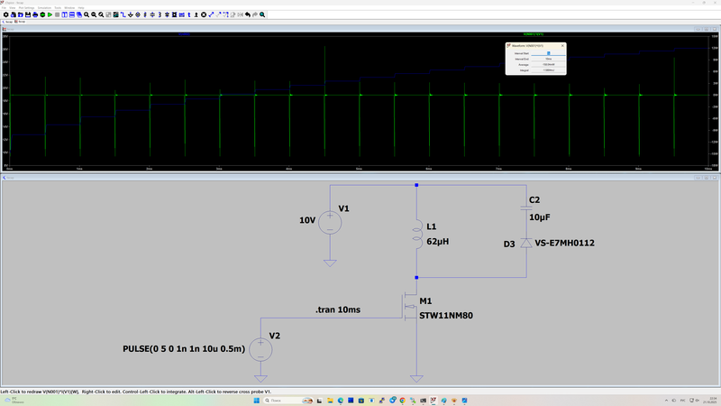 Cимуляции в LTspice ожидаемо показала наличие свободной энергии. Затарты источника питания (интегральное значение) 1,5804 мДж. Энергия заряда конденсатора составила - 3.125мДж