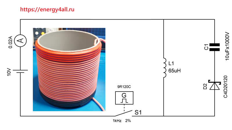 Длительность импульса открытого состояния ключа лимитирует величину тока через индуктивность, определяя максимум тока через катушку индуктивности. После коммутации ключа в цепи формируется импульс ЭДС самоиндукции, амплитуда которого может на порядки превышать напряжение первичного источника. Для достижения COP больше единицы необходимо обеспечить полное завершение переходного процесса перераспределения этой энергии в накопительный конденсатор до инициации следующего цикла. Прерывание процесса преждевременной подачей следующего импульса приводит к неполному использованию энергетического потенциала системы и снижению коэффициента преобразования характерных для классических систем COP ниже единицы.