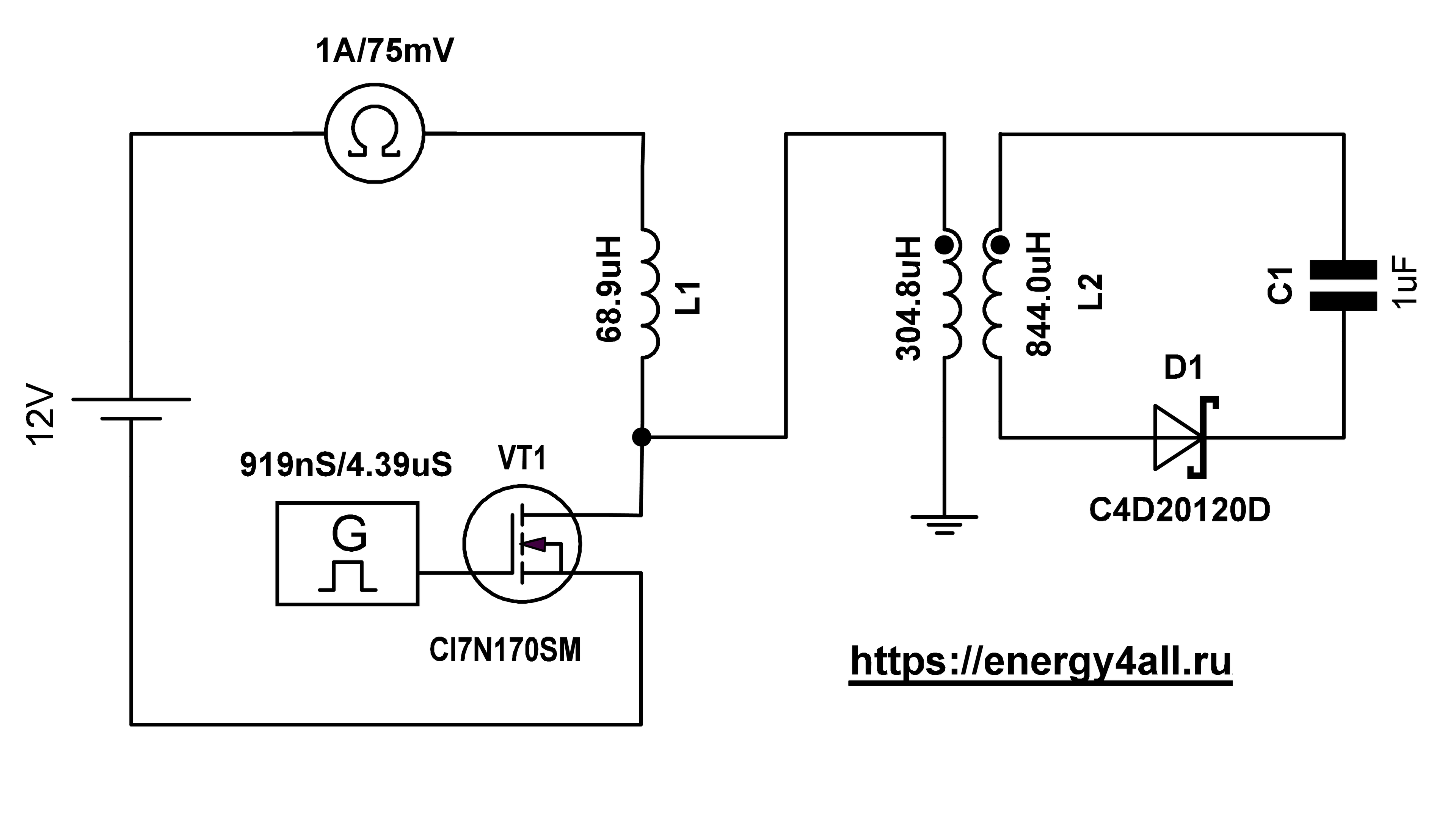 Исследованная схема имеет последовательную топологию: источник питания подключён к индуктивности, которая соединена со стоком транзисторного ключа; исток транзистора заземлён.