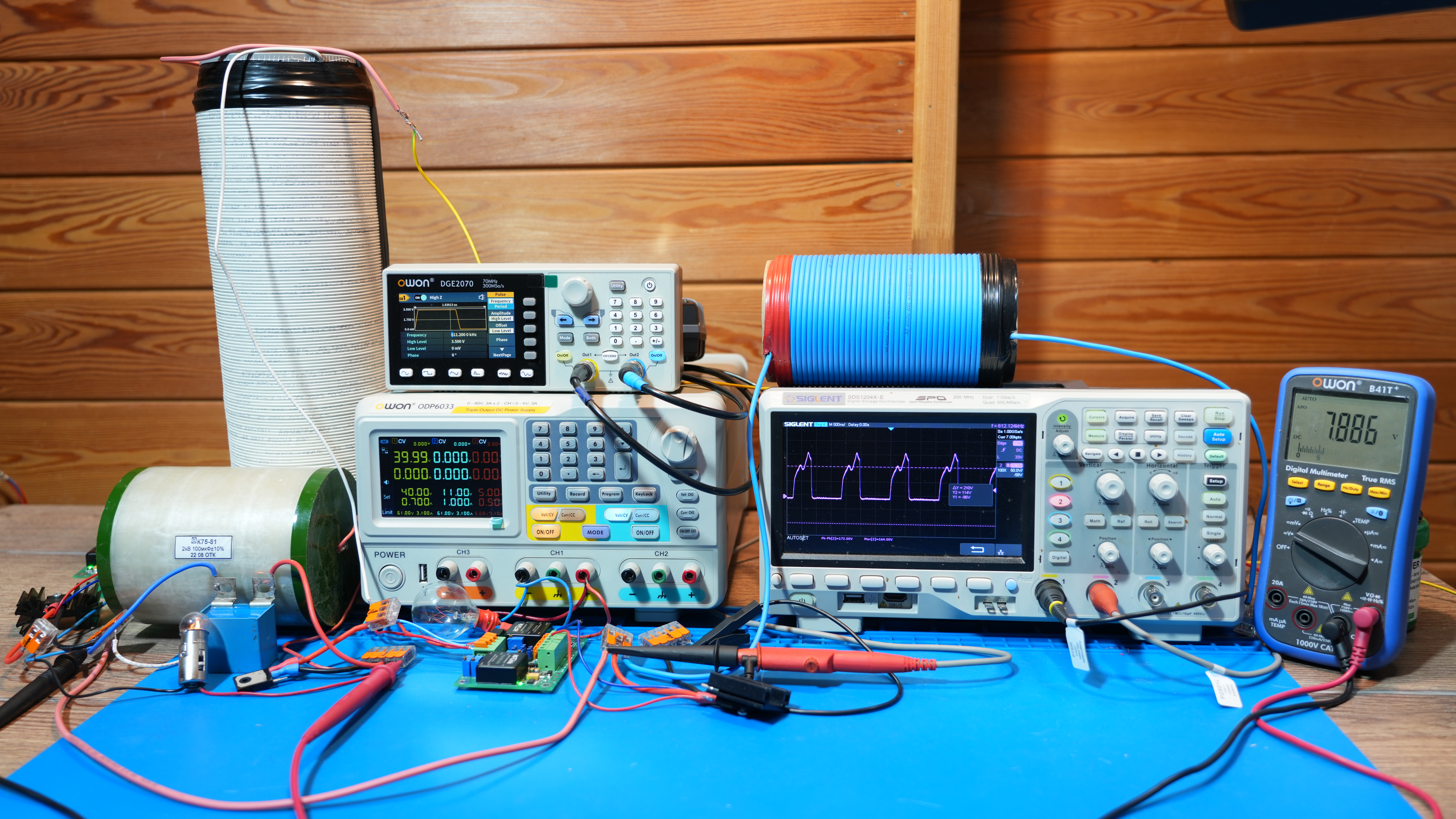 На фотографии лабораторного стенда при напряжении источника питания 42 В амперметр источника OWON ODP6033 (как и прочих цифровых источников) показывает ноль. Однако это не означает отсутствия тока в цепи. Чтобы выяснить, что именно происходит в электрической цепи, между плюсом источника питания и индуктивностью L1 был включён прецизионный шунт.